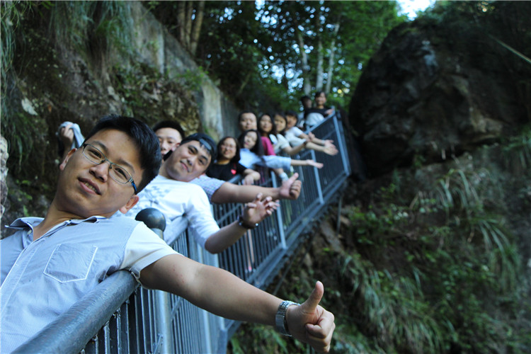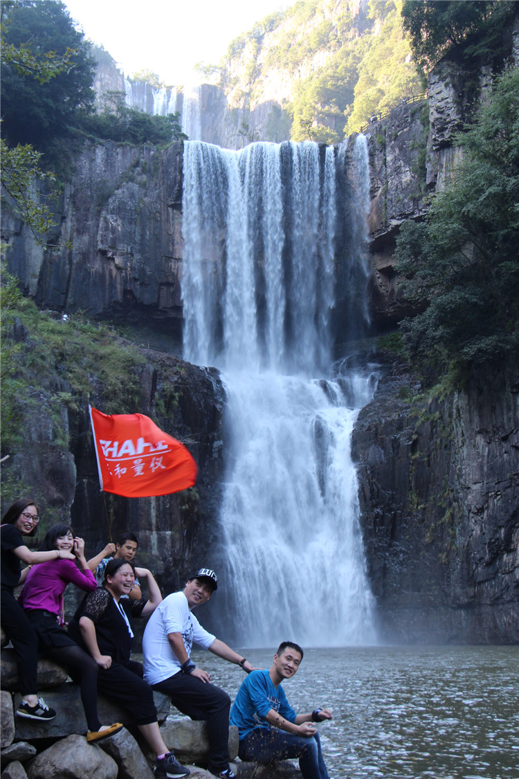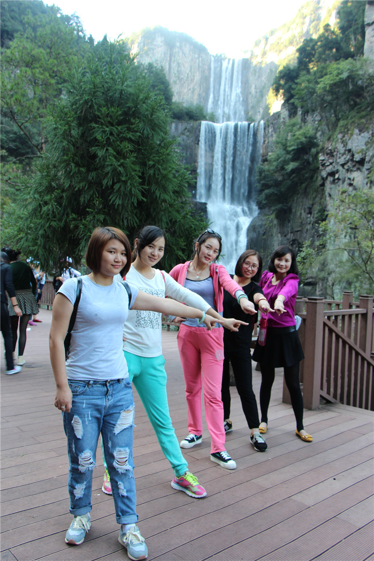 游山玩水之余,也不忘給我們美女帥哥留景做紀念。美景配美女,讓我舍不得這地方了,從下往上觀看,一條白練從空而降,水聲嘩嘩作響,撞擊在石頭上的細小水珠彌漫山間,氣勢磅礴。
